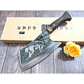 - Chức năng: Chặt xương ống, chân giò, trâu bò - Kích thước: Lưỡi: 22cm, cán: 10cm, rộng: 10cm, dầy: 5ly, trọng lượng: 800g - Cán : Gỗ mun, Khâu đồng đỏ , chốt đinh