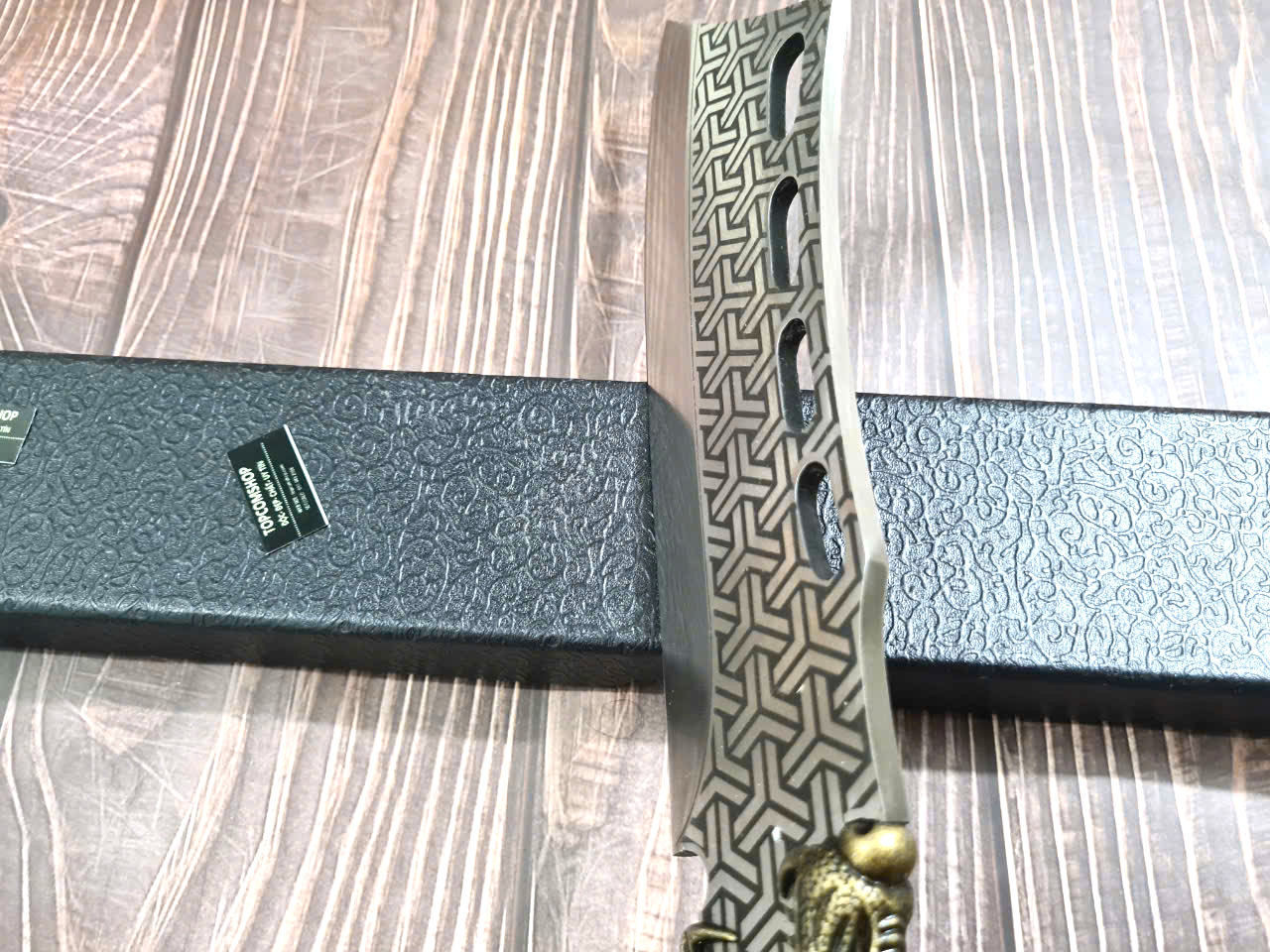 - DAO TR12 : Chiều dài TỔNG: 45cm Chiều dài lưỡi: 24.5cm Chiều rộng lưỡi: 7.5cm, Độ dày lưỡi: 6mm Trọng lượng: 1kg chất liệu lưỡi : 7Cr17MOV (thép 7 crom 17 molypden vanadi) Chất liệu tay cầm: gỗ cẩm lai, phụ kiện khâu đầu hổ và chuôi bằng đồng