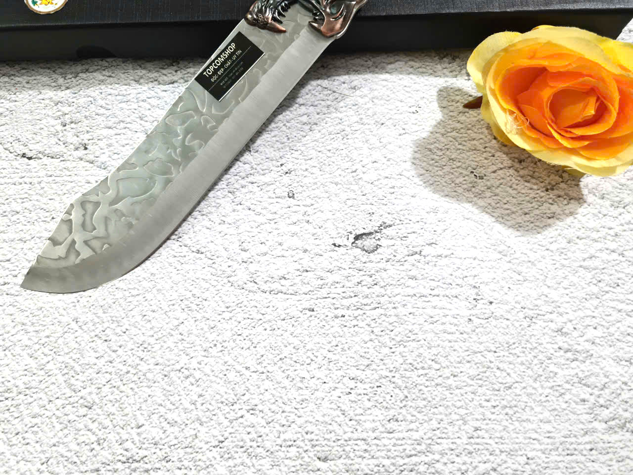 D SỐ 4 : TỔNG DÀI : 32cm, LƯỠI: 18cm,RỘNG : 4.5cm, dày: 3mm, NẶNG : 2.3 lạng, CHẤT liệu lưỡi: 4Cr13MOV (thép 4 crom 13 molypden vanadi).Chất liệu CÁN: nhựa abs xịn . khâu đầu rồng và chuôi bằng thép 4cr13