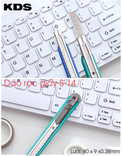 • Dao rọc giấy KDS S-14 là sản phẩm chuyên được sử dụng để cắt hoặc rọc giấy, dao có tích hợp khóa lưỡi an toàn giúp bạn yên tâm hơn khi sử dụng. Dao được làm từ nhựa ABS, phần bao lưỡi dao được làm từ inox nên có độ bền cao, chẳng may bị rơi xuống đất thì cũng không phải lo bị móp méo hay nứt vỡ.