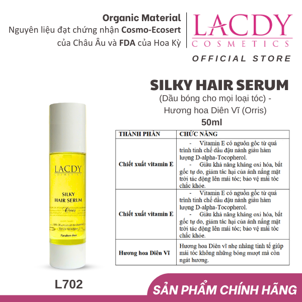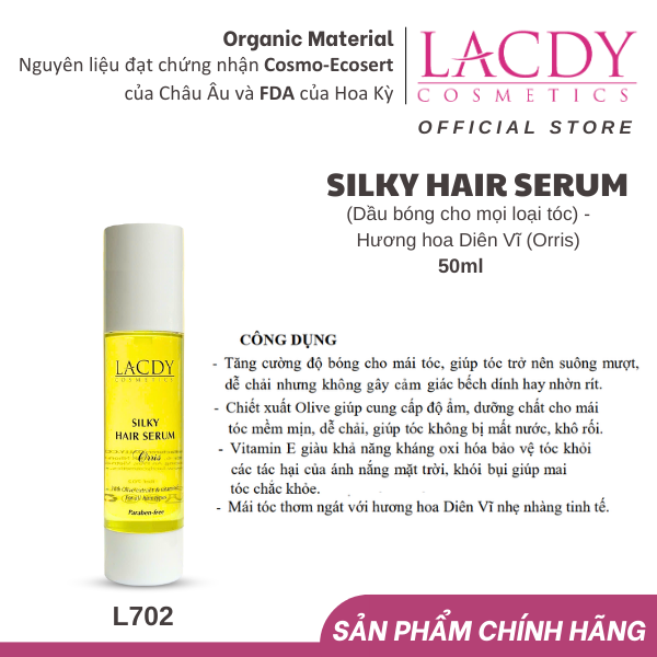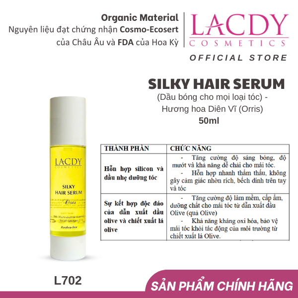 Mua tại TiktokSILKY HAIR SERUM (Dầu bóng cho mọi loại tóc) - Hương hoa Diên Vĩ (Orris) Dầu bóng dành cho mọi loại tóc, đặc biệt cho tóc khô, gãy, rụng, chẻ ngọn. Với dầu olive, chiết xuất từ lá Olive và vitamin E hấp thụ nhanh vào tóc giúp gỡ rối, làm mềm, bóng mượt, ngăn chặn quá trình lão hóa của tóc. Hương hoa Diên Vĩ nhẹ nhàng tinh tế. CÔNG DỤNG