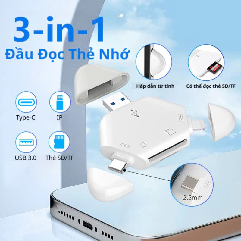 Thông số sản phẩm : Chất liệu : Nhựa ABS Kích thước : 65x65x65 mm Cổng kết nối : Type C, USB, L 8 pin Đầu đọc thẻ : SD , Micro SD (TF) Giúp