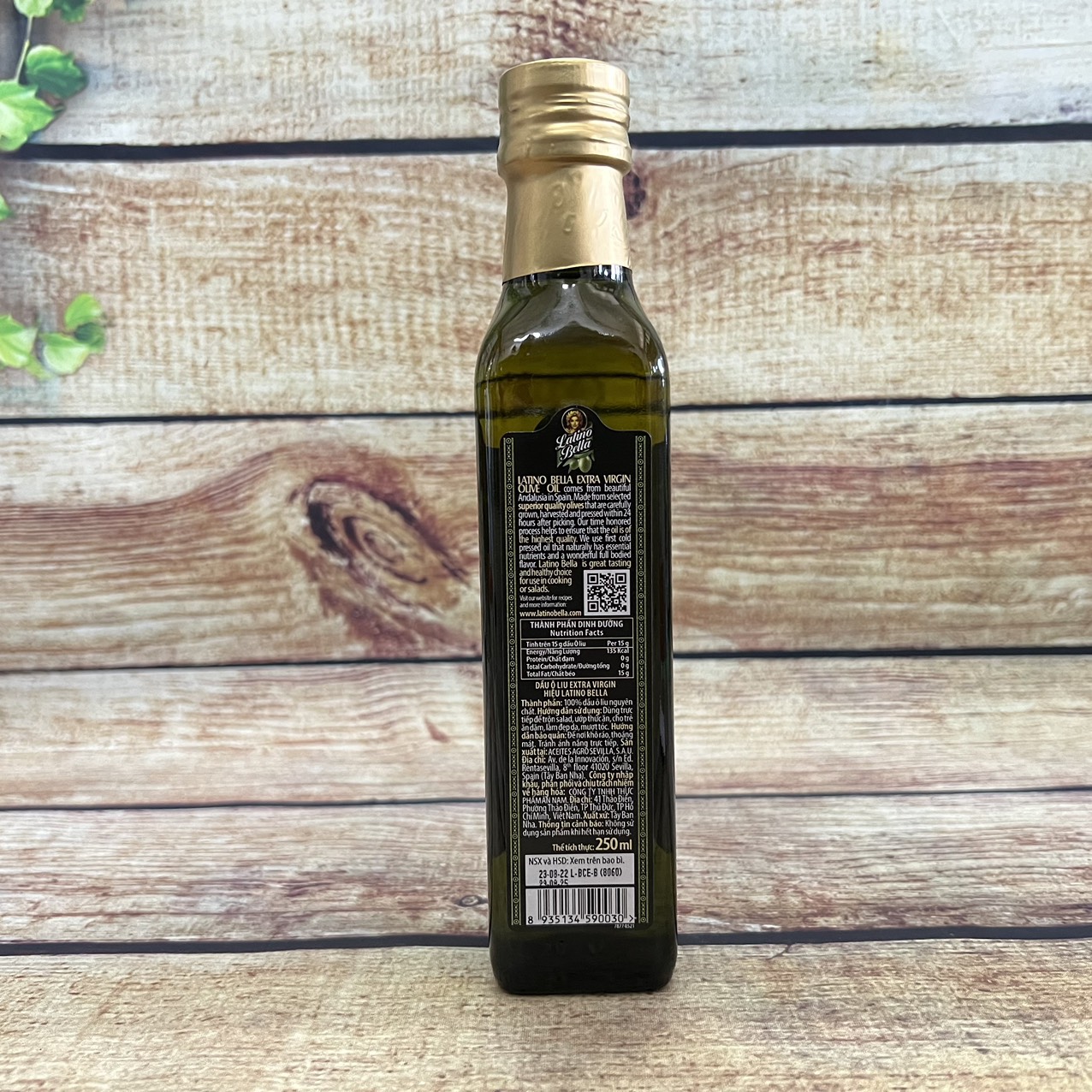 Dầu Oliu Nguyên Chất Latino Bella Extra Virgin Olive Oil 250ml - Xuất xứ: Tây Ban Nha - Thương hiệu: Latino Bella - HSD: 3 năm kể từ ngày sản xuất - Dầu ô-liu nguyên