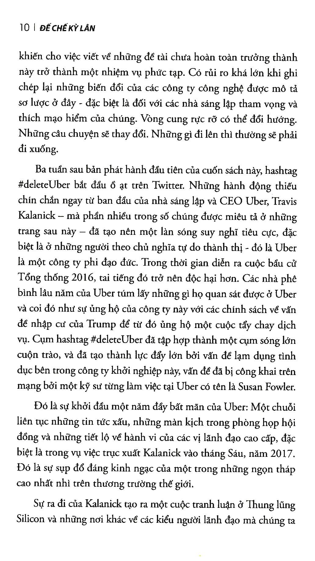 Giờ đây, vào những ngày cuối cùng của năm 2017, những câu hỏi này chiếm lĩnh hầu hết những lát cắt của thế giới truyền thông, công nghệ và chính trị. Thế nên phiên bản mới, mở rộng của cuốn sách này được viết lại, với cái tên là: Đế chế kỳ lân: Uber, Airbnb và cuộc chiến tạo lập thung lũng Silicon mới. Uber và các công ty tương tự chiến đấu vì linh hồn của những thành phố trên khắp thế giới nhưng song song với đó, họ đều có những cuộc chiến của riêng mình.