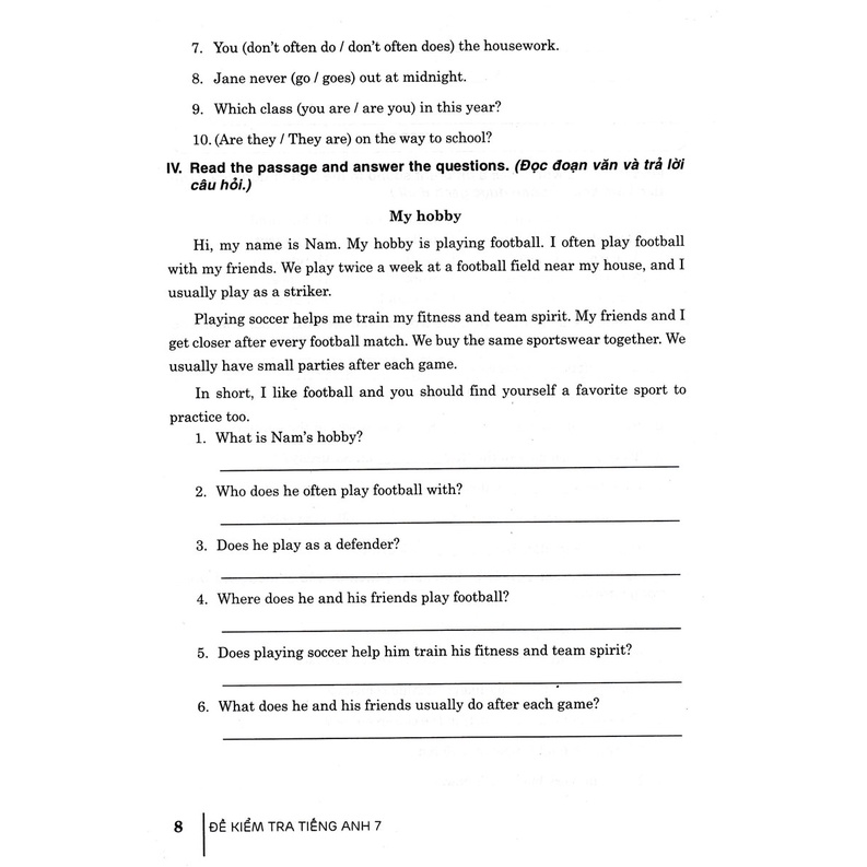 Sách bao gồm nhiều để kiểm tra với rất nhiều dạng khác nhau để các em luyện tập cách giải đề. Nội dung các đề kiểm tra bám sát các phần Ngữ âm, Từ vựng và Ngữ pháp, cũng như các chủ đề của mỗi bài học trong sách giáo khoa Tiếng Anh 7, hơn nữa còn được mở rộng thêm nên sẽ rất dễ dàng để các em vừa kiểm tra lại kiến thức đã học ở trường, vừa luyện tập và phát triển các kĩ năng phát âm, đọc, nói và viết.