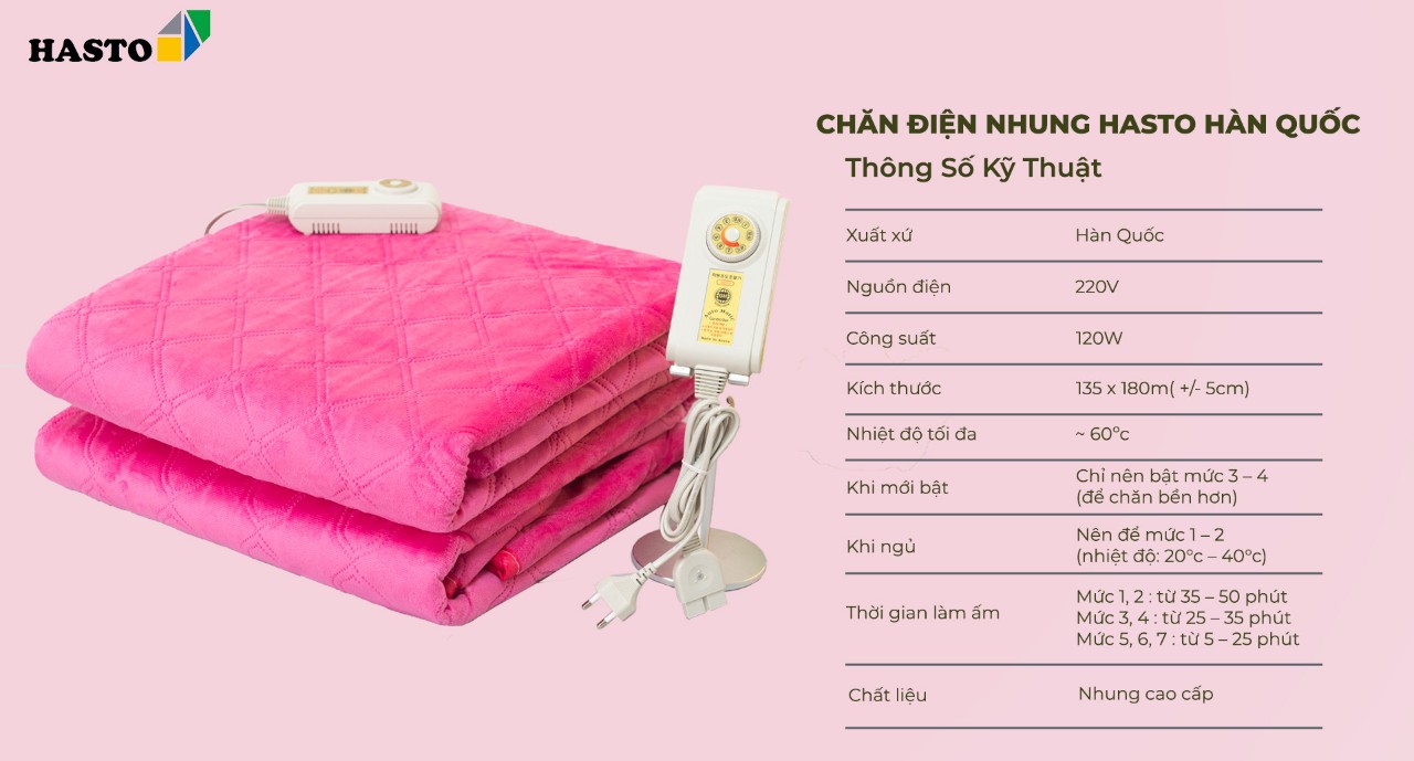 Kích thước: 135*180cm (+\- 5cm ) Công suất : 120w Nhiệt độ : 7 mức điều chỉnh nhiệt độ. - Điện áp : 220v~60Hz - Xuất xứ : Hàn Quốc. - Chất liệu nhung nỉ