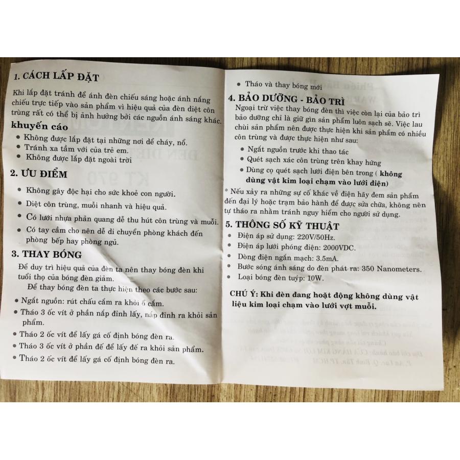 Mua tại Tiktok- ĐÈN DIỆT MUỖI VÀ CÔN TRÙNG KENTOM KT970- Đèn bắt và diệt muỗi và các côn trùng gây hại cho ngôi nhà của bạn.- Bảo vệ sức khỏe cho cả gia đình bạn trước, trong, sau giấc ngủ.- Nhỏ gọn, dễ sử dụng, an toàn và tiết kiệm điện.- Đáy đèn có thể tháo ra rất dễ dàng, thuận tiện cho người dùng khi đổ côn trùng ra để vệ sinh sản phẩm.- Hộp kèm một chiếc chổi bằng gỗ, phía đầu có gắn lông nhựa cách điện dùng để vệ sinh lưới bắt côn trùng.- Đèn còn được thiết kế chi tiết móc treo, giúp người sử dụng thuận tiện hơn trong quá trình bảo quản, cất giữ sản phẩm.- Đèn sử dụng bóng đèn chỉ có công suất 10W nên khá tiết kiệm điệm.