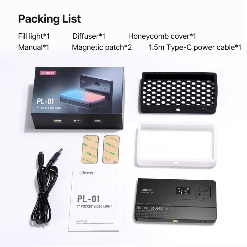 - Bộ sản phẩm gồm: x1 Light x1 Soft light hood x1 Honeycomb x2 Magnetic patch x1 Cáp sạc Type-C (1,5m) x1 Sách HDSD