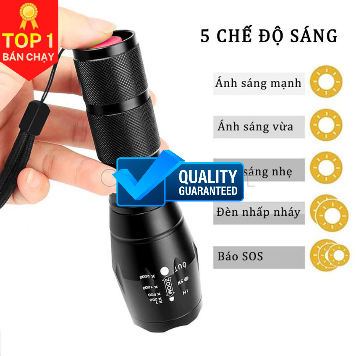 - Chế độ chiếu sáng: Mạnh nhất / Mạnh / Vừa / Nhấp nháy / SOS