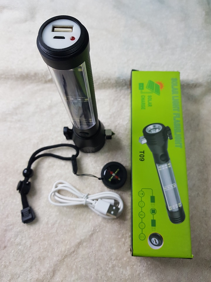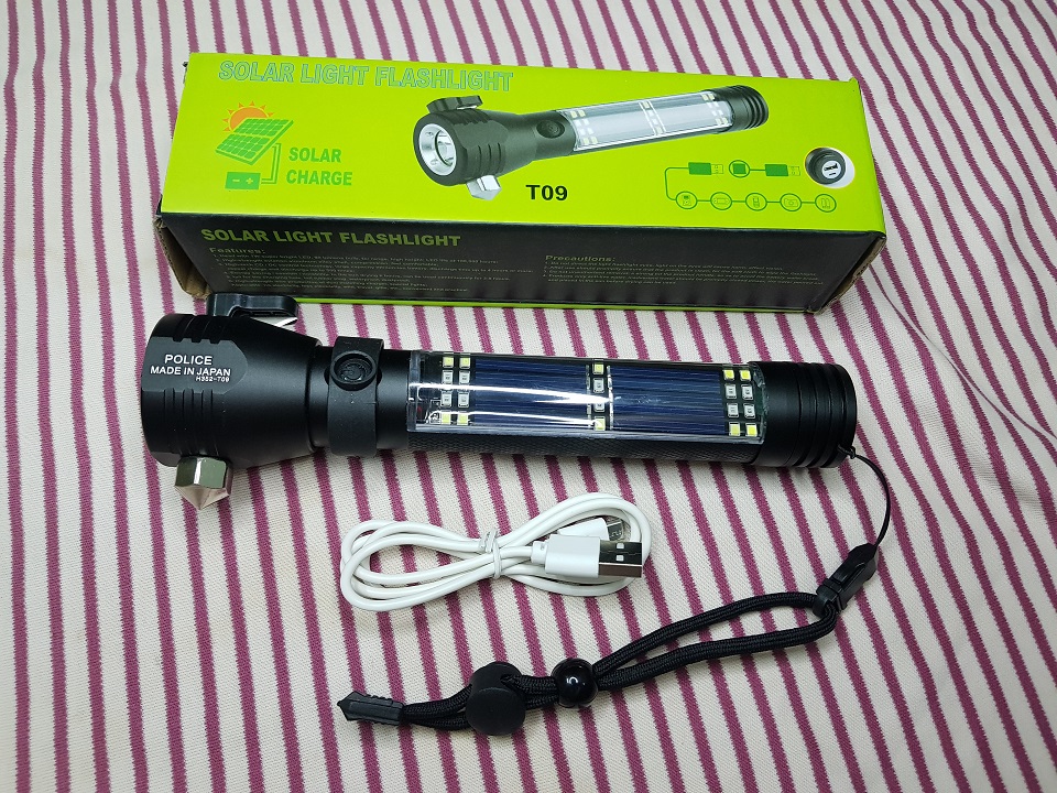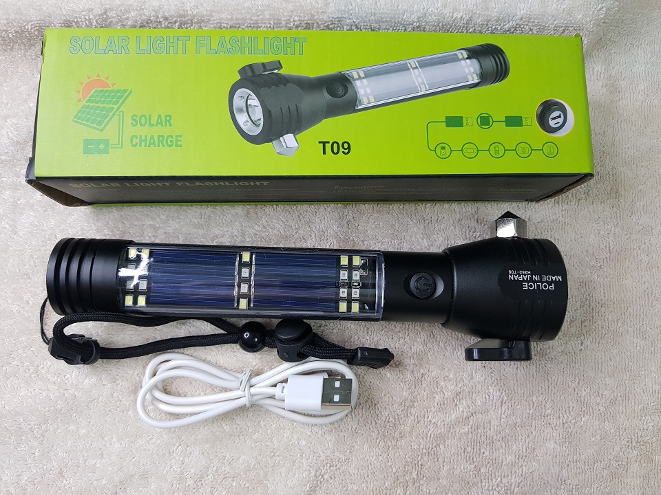 - - Chức năng và Công dụng: ngoài là đèn pin thông thường, còn là đèn cứu hộ khi đi trên biển (chức năng nhấp nháy), khi tai nạn xe hơi có đầu lưỡi dao cắt dây an toàn, có đầu búa để đập kính,khi đi rừng thì có la bàn, có chức năng là sạc dự phòng để sạc cho điện thoại, nguồn điện có thể sạc từ điện gia dụng hoặc điện năng lượng mặt trời