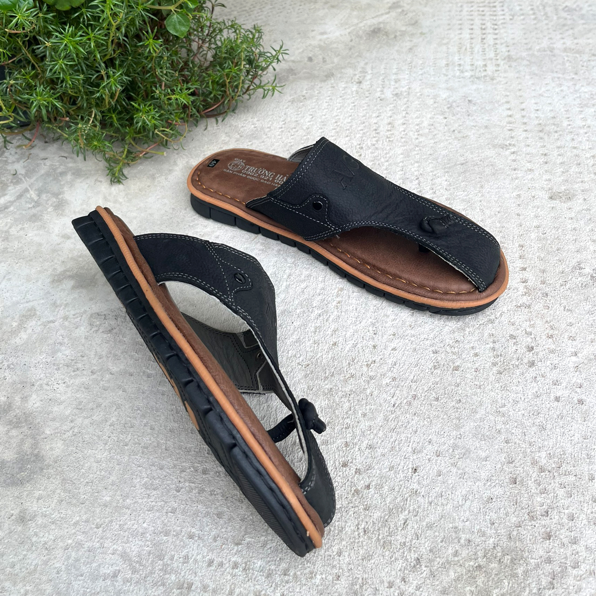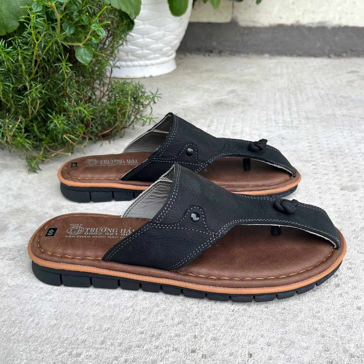 ✨Dép nam bít mũi xỏ ngón da bò Trường Hải đế cao 3cm màu đen DBM175
