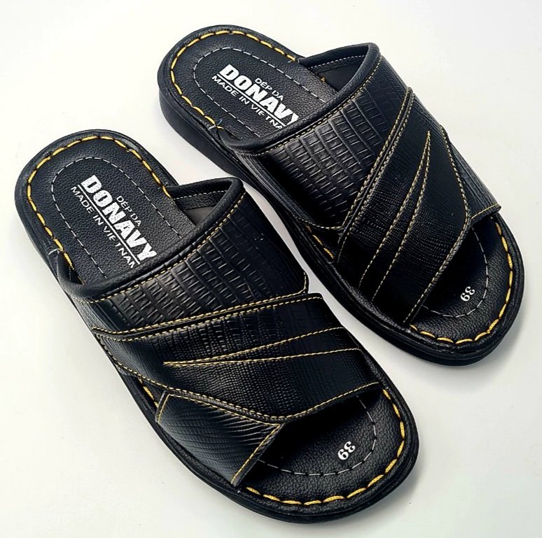 Dép Da Nam - Lịch Lãm & Thoải Mái Mỗi Ngày - Chất liệu cao cấp: Sử dụng da tổng hợp chất lượng, mềm mại, bền bỉ theo thời gian, mang lại cảm giác êm ái và thoáng khí cho bàn chân. - Thiết kế sang trọng: Tông màu đen lịch lãm, kết hợp với đường chỉ may tinh tế và logo kim loại nổi bật – tôn lên vẻ nam tính, trưởng thành. - Đế chống trượt: Đế EVA siêu nhẹ, độ đàn hồi tốt, kết hợp vân đế tăng độ ma sát – an toàn khi di chuyển trên nhiều bề mặt. - Form ôm chân: Thiết kế bản quai ngang rộng, ôm gọn bàn chân nhưng không gây bí bách, dễ xỏ vào – thích hợp cho người trung niên và người lớn tuổi. - Ứng dụng đa năng: Phù hợp sử dụng trong nhà, đi dạo phố, đến văn phòng hoặc các dịp gặp gỡ thân mật. Lựa chọn tuyệt vời cho quý ông yêu thích sự thoải mái, đơn giản nhưng vẫn giữ được nét tinh tế trong từng bước chân.