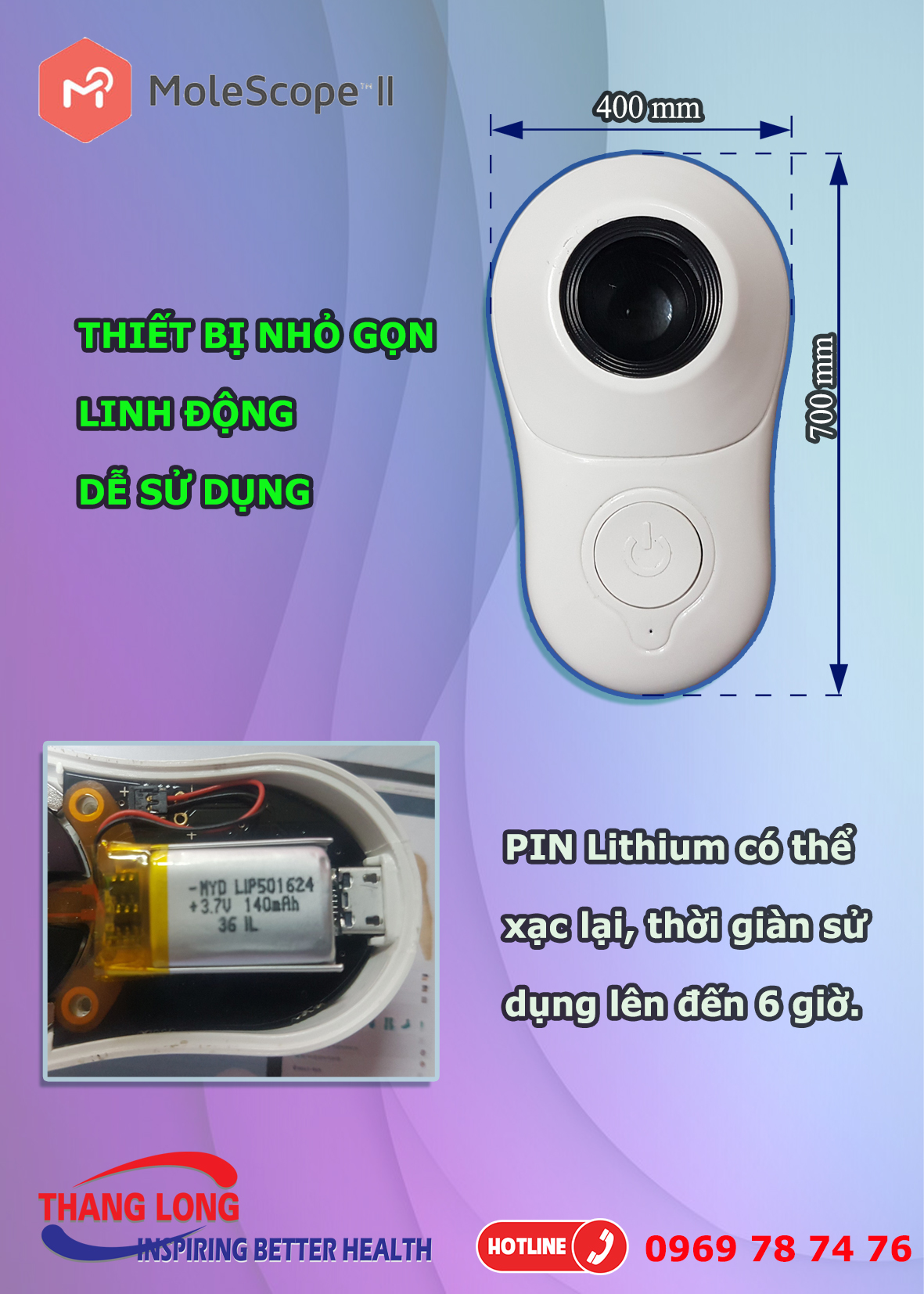 1: Mô tả sản phẩm: Mole Scope II là thiết bị soi da di động nhãn hiệu MetaOptima của Canada được thiết kế để gắn vào điện thoại thông minh và máy tính bảng để chụp da và các bề mặt cơ thể khác với chế độ soi phân cực chéo giúp quan sát, đánh giá tổn thương lỗ chân lông qua da và tóc một cách chính xác, hiệu quả trong việc đưa ra phát đồ điều trị bệnh lý cho bác sỹ  Là thiết bị tuyệt vời trong việc hỗ trợ chẩn đoán hình ảnh cho các bệnh lý về da liễu 2: Ưu điểm nổi bật ️ Thiết bị nhỏ gọn, linh động, dễ sử dụng ️Sử dụng 6 đén Led trắng với ánh sáng phân cực chéo cho hình ảnh sắc nét với độ tương phản cao, soi tận sâu dưới da 1-2mm,. ️Độ phóng đại lên đến 60X, cho hình ảnh vết tổn thương sắc nét. ️Pin Lithium siêu bền, có thể sử dụng lên đến 6 giờ, có thể sạc lại ️Thông qua điện thoại hoặc máy tính bảng có thể kết nối lên Tivi, máy tính để bàn một cách dễ dàng, giúp bác sỹ và bệnh nhận quan sát vết tổn thương một cách rõ nét nhất.   CAM KẾT CỦA NHÀ PHÂN PHỐI VỀ CHẤT LƯỢNG SẢN PHẨM VÀ DỊCH VỤ BÁN HÀNG: ️ Cung cấp sản phẩm theo đúng hình ảnh mô tả với chất lượng tốt nhất. ️ Bảo hành thiết bị 12 tháng. ️ Hàng có sẵn 100%, đúng chủng loại khách đặt, giao hàng nhanh. ️ Tư vấn nhiệt tình 24/7 cho quý khách về bất cứ thắc mắc gì trước và sau khi mua sản phẩm.