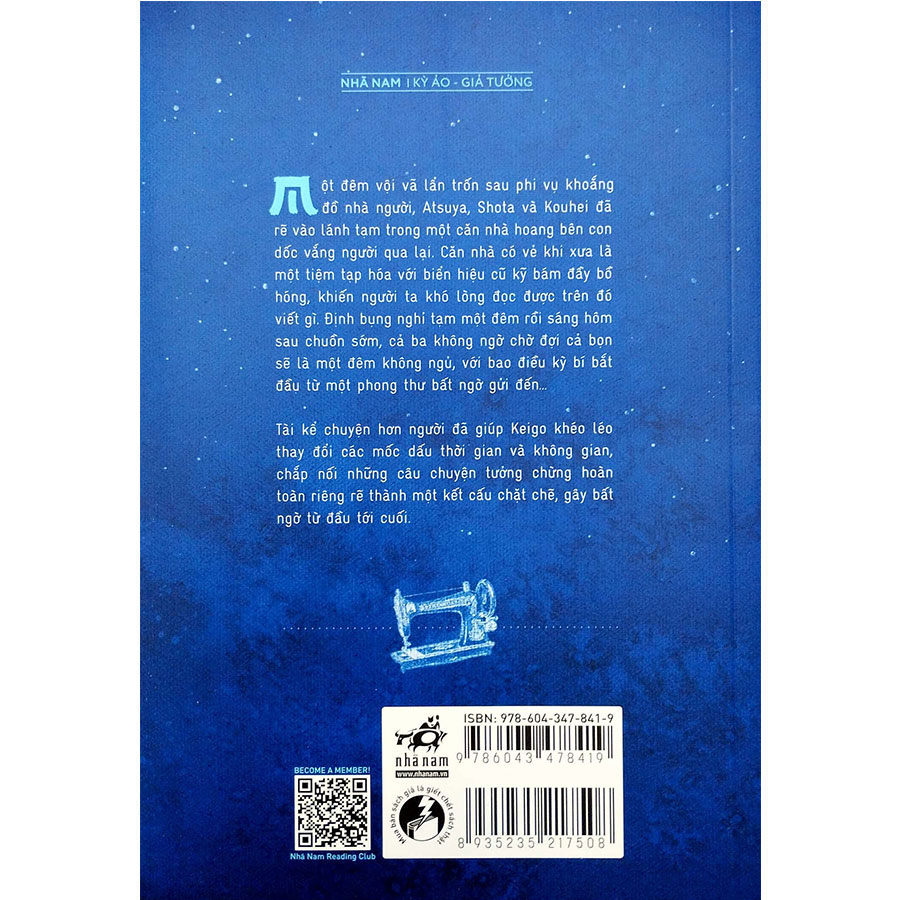 THÔNG TIN XUẤT BẢN: - Công ty phát hành: Nhã Nam - Tác giả: Higashino Keigo - Dịch giả: Ngọc Châu - Nhà xuất bản: Hội Nhà Văn - Kích thước: 14 x 20.5cm -