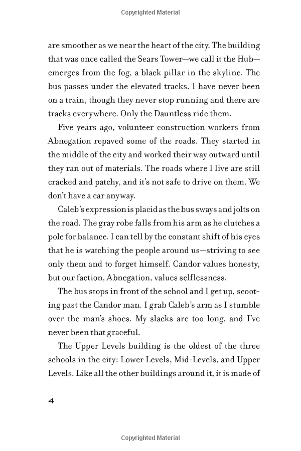 Roth: I tried to construct the factions so that they spanned a wide range of virtues. Abnegation, for example, includes five of the traditional “seven heavenly virtues:” chastity, temperance, charity, patience, and humility. That said, it would be interesting to have a faction centered on industriousness, in which diligence and hard work are valued most, and laziness is not allowed. They would be in constant motion, and would probably be happy to take over for the factionless. And hard-working people can certainly take their work too far, as all the factions do with their respective virtues. I’m not sure what they would wear, though. Overalls, probably.
