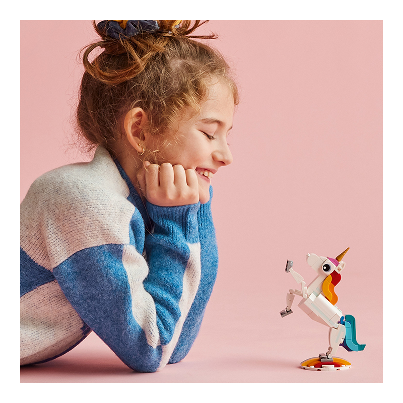 Du hành đến một vùng đất thần thoại xa xôi để vui chơi với những sinh vật huyền bí. Hãy xem chú Kỳ lân ma thuật với chiếc sừng vàng băng qua cầu vồng. Để tạo nên những câu chuyện hấp dẫn hơn nữa, bạn có thể lắp ráp lại mô hình thành một con cá ngựa bơi dưới đáy biển hoặc biến nó thành một chú công dễ thương với chiếc đuôi đầy lông sặc sỡ.Sự lựa chọn là của bạn với bộ mô hình 3 trong 1 này. • 3 sinh vật huyền bí trong 1 bộ – Các bé nhỏ có thể lắp ráp 3 mô hình nhiều màu sắc khác nhau với bộ đồ chơi LEGO Creator 3 trong 1 Kỳ Lân Sắc Màu (31140) này • Khoảnh khắc vui chơi dài lâu – Trẻ em có thể tưởng tượng những câu chuyện thú vị với 3 bối cảnh khác nhau ở vùng đất thần thoại: băng qua cầu vồng với Kỳ lân thần kỳ, bơi cùng cá ngựa hoặc đắm chìm trong vẻ đẹp với công • Mô hình sáng tạo – Mỗi sinh vật trong số 3 sinh vật đều có các bộ phận cơ thể có thể tạo được: kỳ lân có thể di chuyển chân và móng guốc; cá ngựa cử động đuôi, vây và đầu; và công có đuôi và mắt có thể cử động được