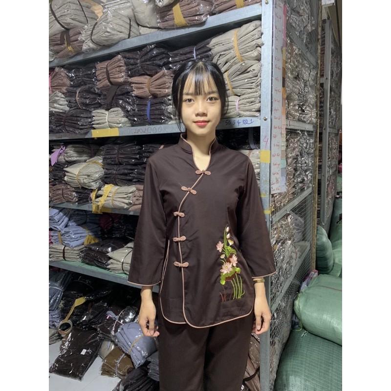 Mẫu pháp phục nữ - quần áo Phật tử đi chùa, đồ lam chất kate lụa mềm có co giãn Sen Hồng 0898553583