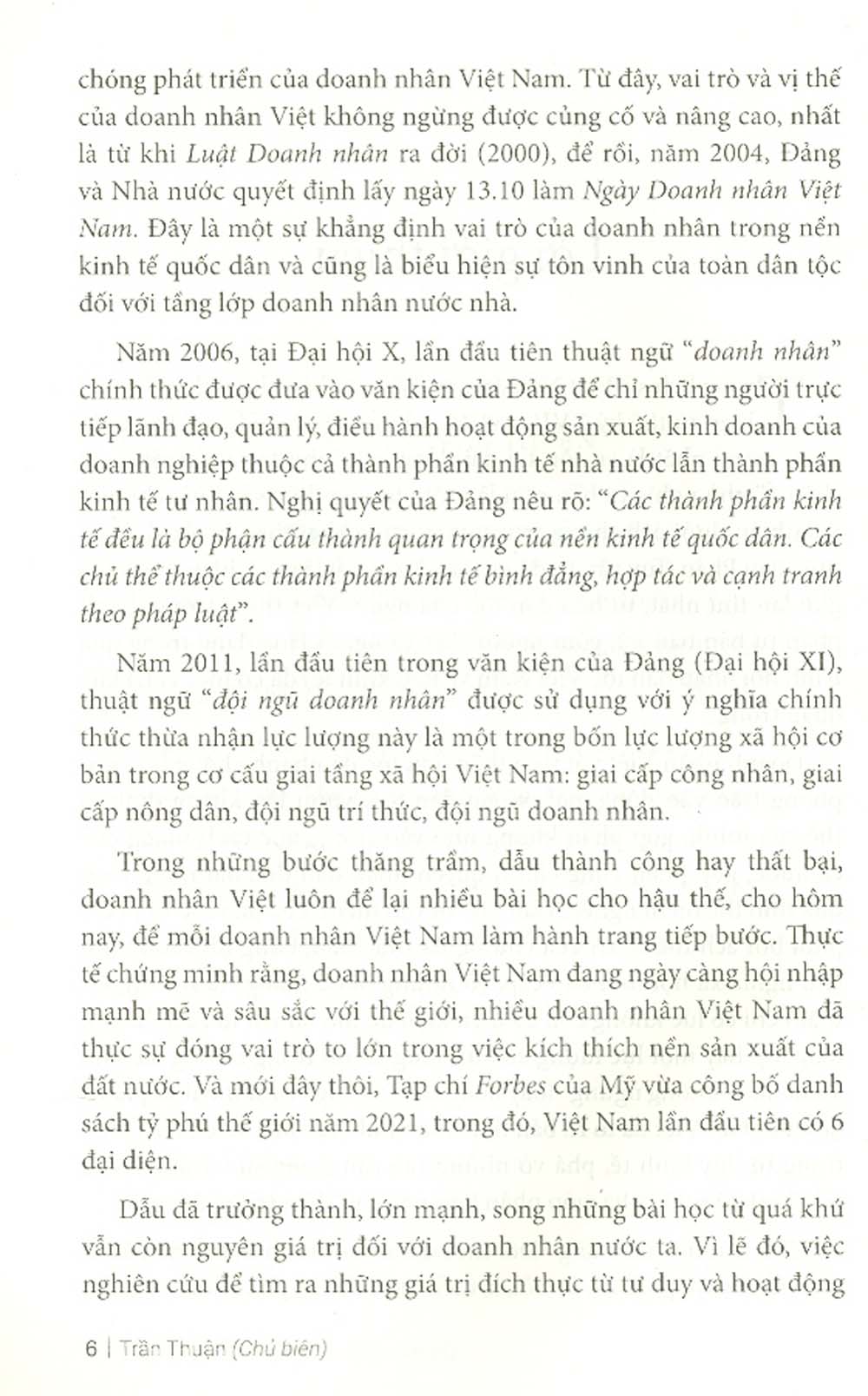 Trải qua bao thăng trầm, dẫu có lúc thành công hay thất bại nhưng các doanh nhân Việt Nam trong lịch sử luôn để lại nhiều bài học cho hậu thế và đã luôn đóng vai trò là đầu tàu trong việc phát triển kinh tế đất nước. Mới đây, Tạp chí Forbes của Mỹ vừa công bố danh sách tỉ phú thế giới năm 2021, trong đó Việt Nam lần đầu tiên có 6 đại diện đã nói lên sự lớn mạnh của những khát vọng Việt và họ đang viết tiếp nhiều trang mới cho cuốn sách Doanh nhân Việt Nam trong lịch sử ra mắt người đọc hôm nay.