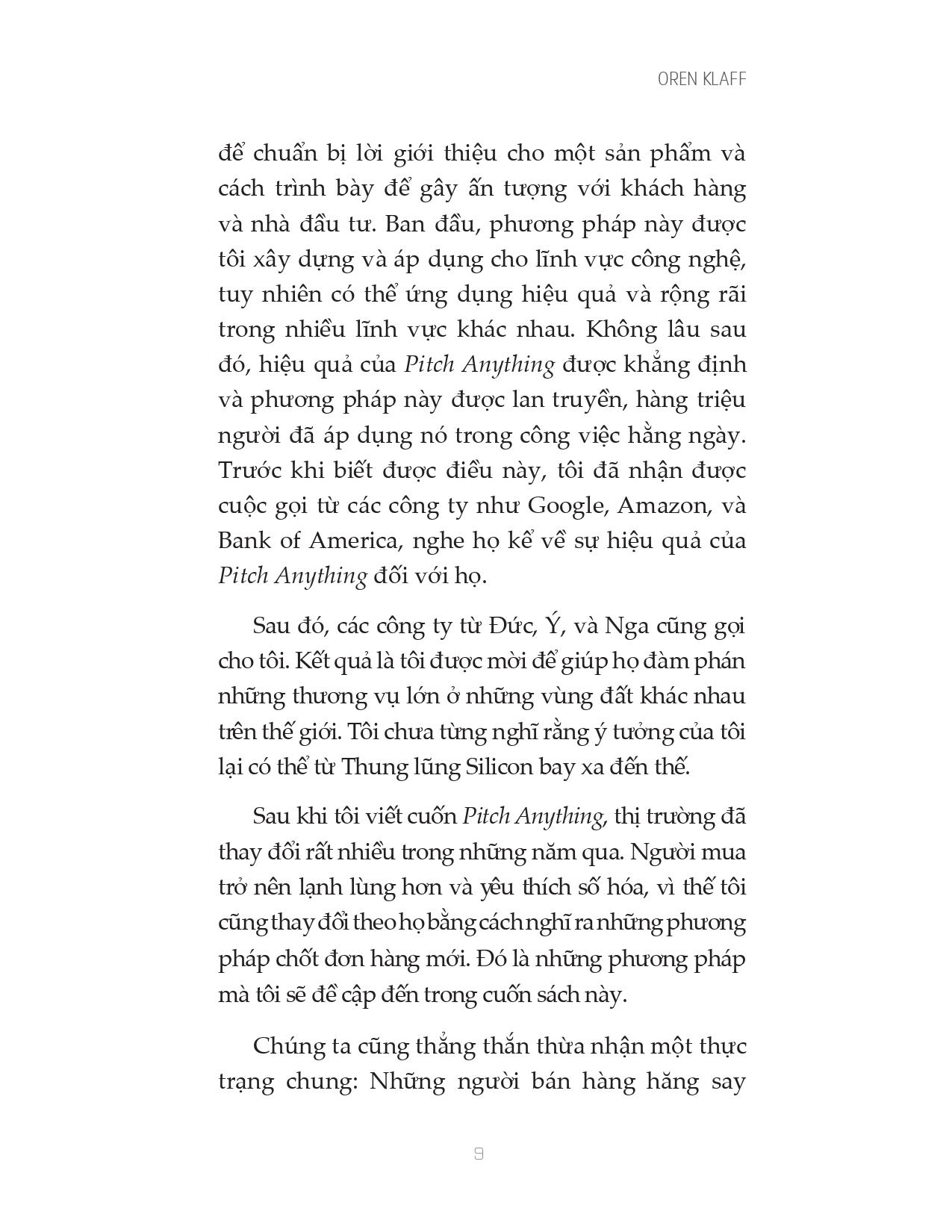Oren Klaff là một trong những chuyên gia hàng đầu thế giới về bán hàng, huy động vốn và đàm phán. Cuốn sách đầu tiên của ông, Pitch Anything, được in hơn 1.000.000 bản trên toàn thế giới. Ông viết cho Harvard Business Review, Inc., Advertising Age, Entrepreneur và xuất hiện trên hàng trăm tạp chí, podcast và blog. Ông cũng là đối tác đầu tư trong quỹ đầu tư cổ phần tư nhân trị giá 200 triệu đô la.