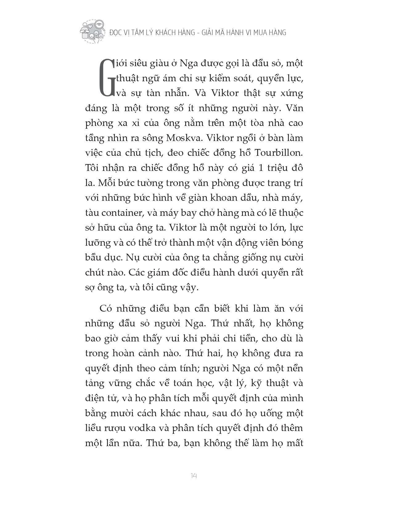 Cuốn sách “Đọc vị tâm lý khách hàng - Giải mã hành vi mua hàng” cung cấp cho bạn phương pháp bán hàng hoàn toàn mới, không chèo kéo, không gây áp lực, giúp bạn có thể bán bất kỳ thứ gì cho bất kỳ ai. Trọng tâm của cuốn sách nằm ở phương pháp gieo một ý tưởng vào tâm trí người khác, biến ý tưởng của bạn thành của người mua. Tác giả Oren hướng dẫn bạn những quy tắc “bí quyết kinh doanh” - để làm được điều đó cũng như các bước để chinh phục mục tiêu của bạn mà không cần gây áp lực lên họ. Cuốn sách này chính là chìa khóa giúp bạn “lật ngược thế cờ”, một “game changer” thực sự.