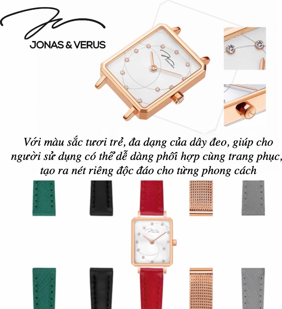 Đồng hồ đeo tay nữ hiệu JONAS & VERUS, mã số X00719-Q3.WWWLRD Dây da Italy mềm mại nổi bật hơn với viền mặt đính đá Swarovski,là một trong nhiều những chiếc đồng hồ Jonas &