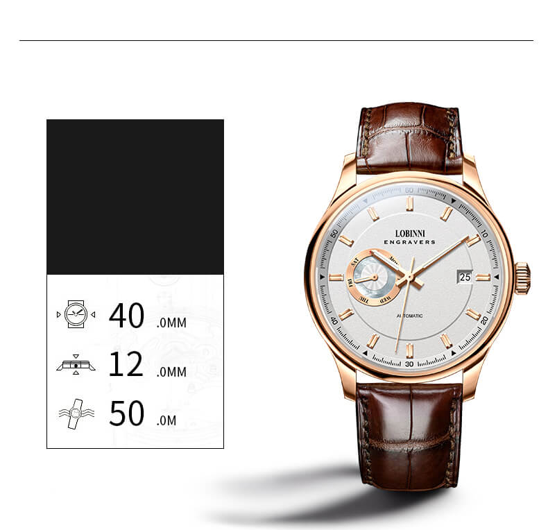 Đồng hồ nam chính hãng LOBINNI Thụy Sỹ Thiết kế sang trọng, đẳng cấp cho quý ông Thời gian trữ cót lâu lên đến 40h Chống nước 5ATM, Kính sapphire Toàn bộ máy được làm