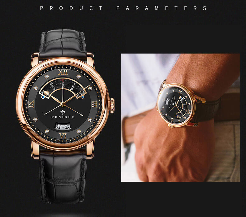 Đồng hồ Thụy Sĩ luôn mang lại cho người dùng một khoái cảm đặc biệt về cả diện mạo lẫn chất lượng. Như chiếc Poniger này, đẳng cấp thể hiện qua dòng chữ "SWISS MADE" được in trên mặt số. Bên cạnh đó còn là: