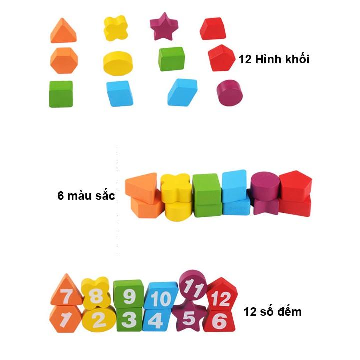 - 12 khối hình nhỏ có hình dạng khác nhau được sơn 6 màu: xanh lá mạ, xanh lá cây, hồng, đỏ, cam, xanh dương.