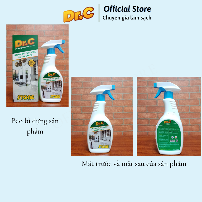 - Dr.C stone có màu vàng nhạt, mùi Amoniac nhẹ. Dr.C stone tẩy rửa làm sạch dựa trên công thức phẩn hủy sinh học. Dr.C stone là hợp chất không axit, chứa các chất hoạt động bề mặt có tác dụng tẩy rửa làm sạch các vết sơn keo, dầu mỡ, vết bám lâu ngày trên bề mặt đá Cẩm thạch ( Marble), đá Hoa Cương ( Granite), trên nhựa vinyl, terrazzo, gạch men và hầu hết các bề mặt sàn cứng khác.