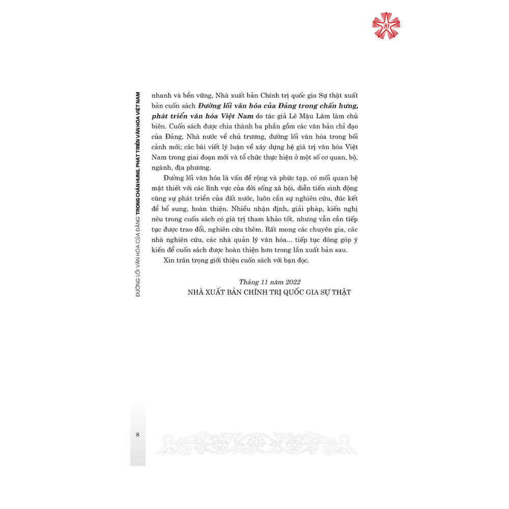 Nội dung gồm các văn bản chỉ đạo mới của Đảng, Nhà nước về chủ trương, đường lối văn hóa trong bối cảnh mới; toàn văn bài viết, phát biểu của Tổng Bí thư Nguyễn Phú Trọng tại Hội nghị văn hóa toàn quốc, tháng 11/2021. Cùng với các bài viết lý luận về xây dựng hệ giá trị văn hóa Việt Nam trong giai đoạn mới và việc tổ chức thực hiện ở một số cơ quan, bộ, ngành, địa phương…