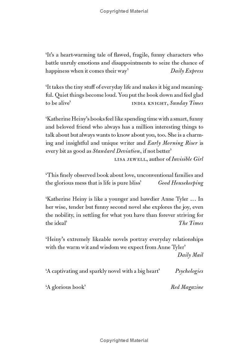 Early Morning Riser ‘Gorgeous. Very, very funny in a knowing wry way but so tender, so beautiful. I loved all the characters.’ Marian Keyes ‘Warm, witty, touching – and frequently hilarious’...