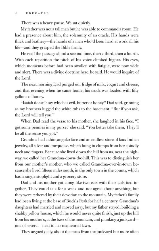 Born to survivalists in the mountains of Idaho, Tara Westover was seventeen the first time she set foot in a classroom. Her family was so isolated from mainstream society that there was no one to ensure the children received an education, and no one to intervene when one of Tara's older brothers became violent. When another brother got himself into college, Tara decided to try a new kind of life. Her quest for knowledge transformed her, taking her over oceans and across continents, to Harvard and to Cambridge University. Only then would she wonder if she'd traveled too far, if there was still a way home.