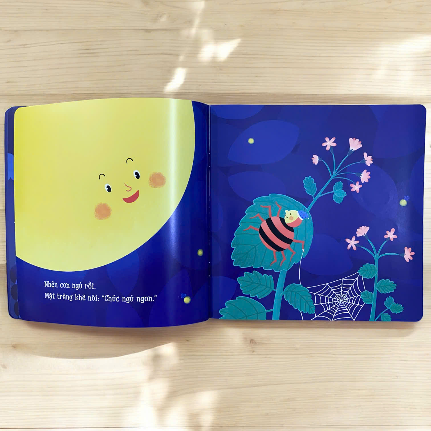 Khi màn đêm buông xuống, mặt trăng cũng thao thức và bắt đầu chuyến đi dạo khắp khu rừng để gửi những lời chúc ngủ ngon thật êm ái. Qua từng trang sách, bé sẽ thấy mặt trăng nhẹ nhàng ghé thăm và chúc từng bạn động vật ngủ thật ngon – từ bạn nhện, bạn nhím, bạn thiên nga đến bạn cừu, tất cả đều đã say giấc nồng. Đến lượt mình, mặt trăng cũng được bạn cú mèo khẽ chúc ngủ ngon, khép lại một đêm yên bình.