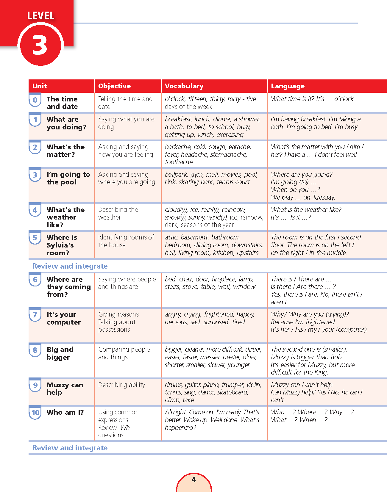 Sách: Learning English 4 - Dành Cho Học Sinh Lớp 4 NỘI DUNG VÀ CẤU TRÚC CỦA QUYỂN SÁCH : Bảng mục lục: Chỉ rõ các mục tiêu chính và trọng tâm của mỗi bài