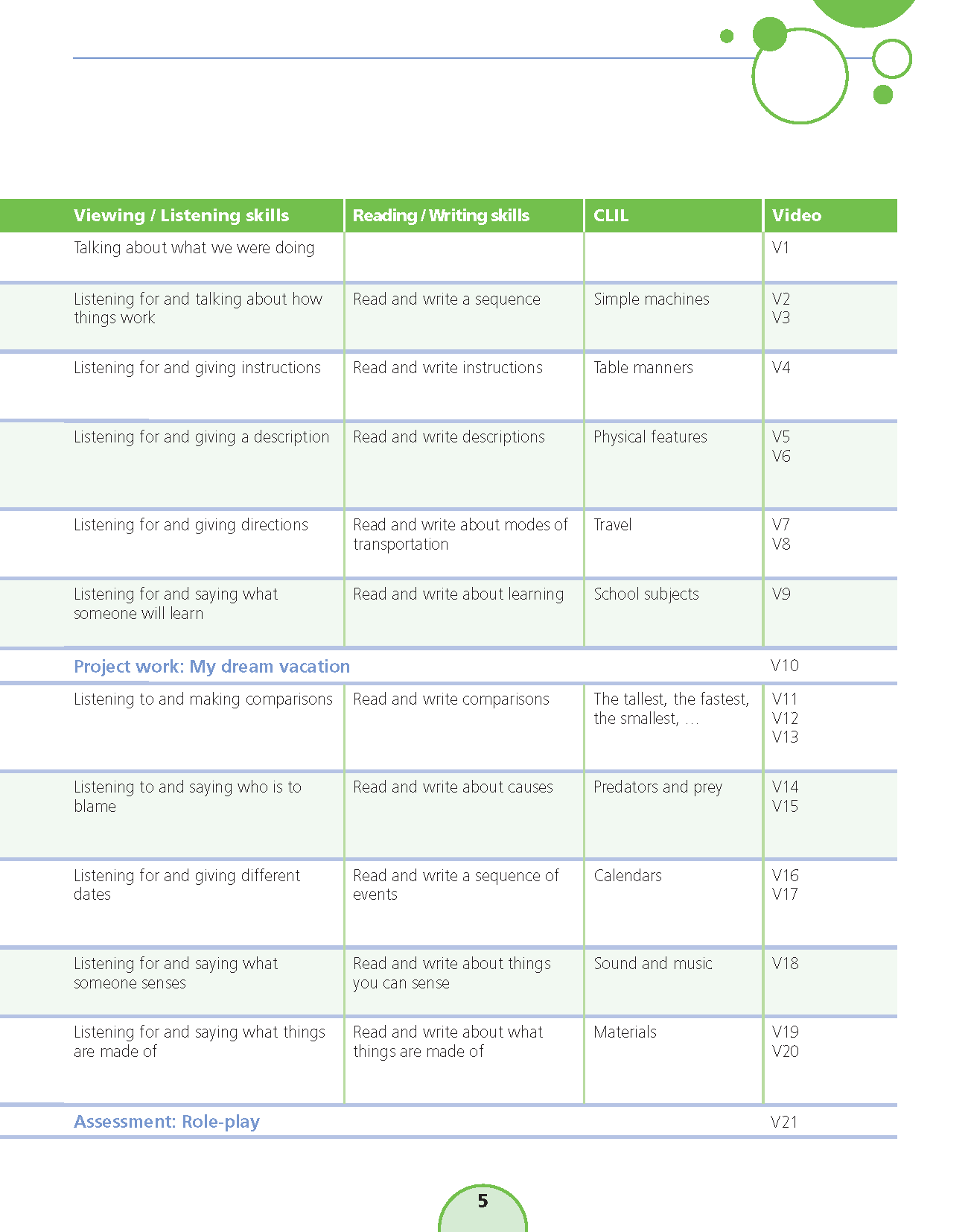 Sách: Learning English 5 - Dành Cho Học Sinh Lớp 5 NỘI DUNG VÀ CẤU TRÚC CỦA QUYỂN SÁCH : Bảng mục lục: Chỉ rõ các mục tiêu chính và trọng tâm của mỗi bài