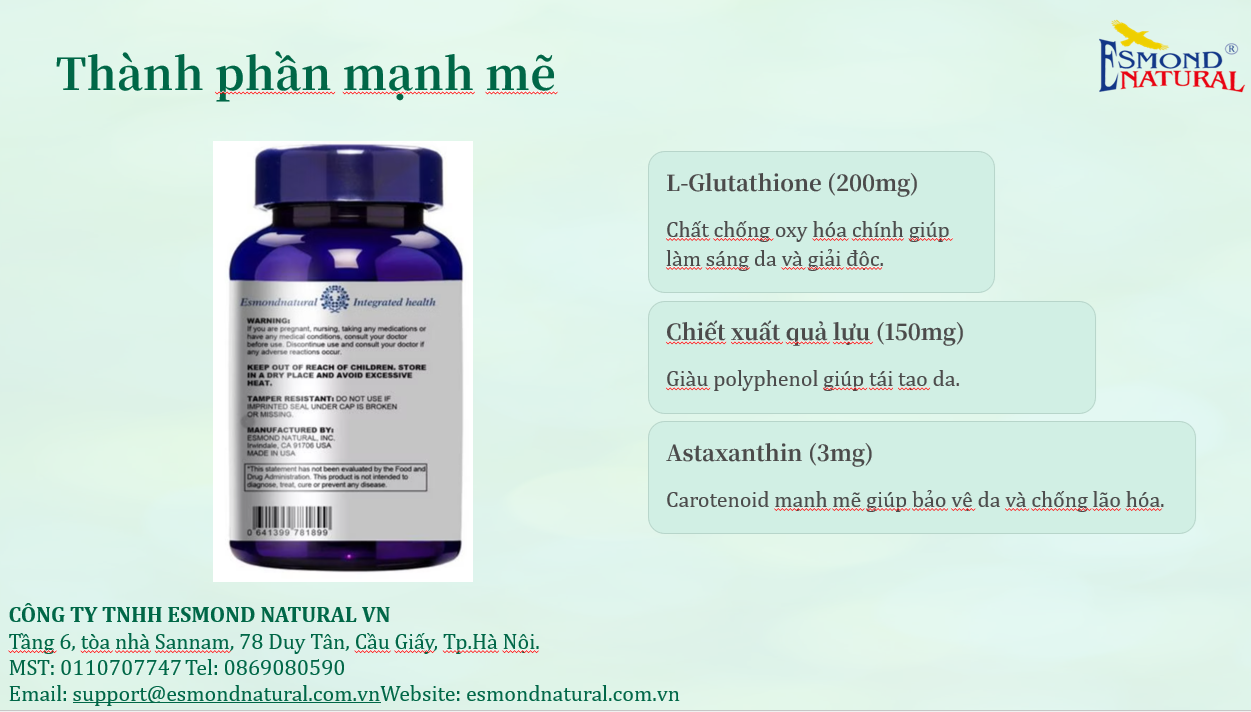 ✨Esmond Natural Beautiful Skin - Hỗ trợ làm sáng da & chống Oxy hóa - 60 viên nang - Made in USA Dưỡng ẩm & tăng đàn hồi