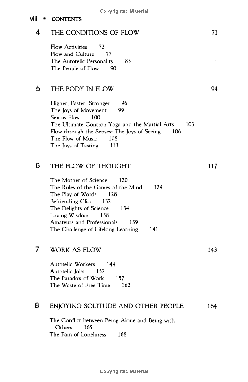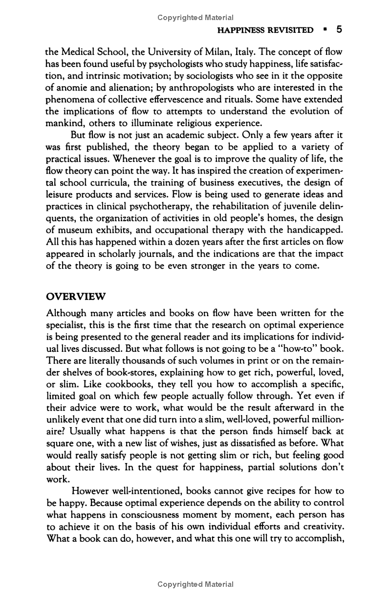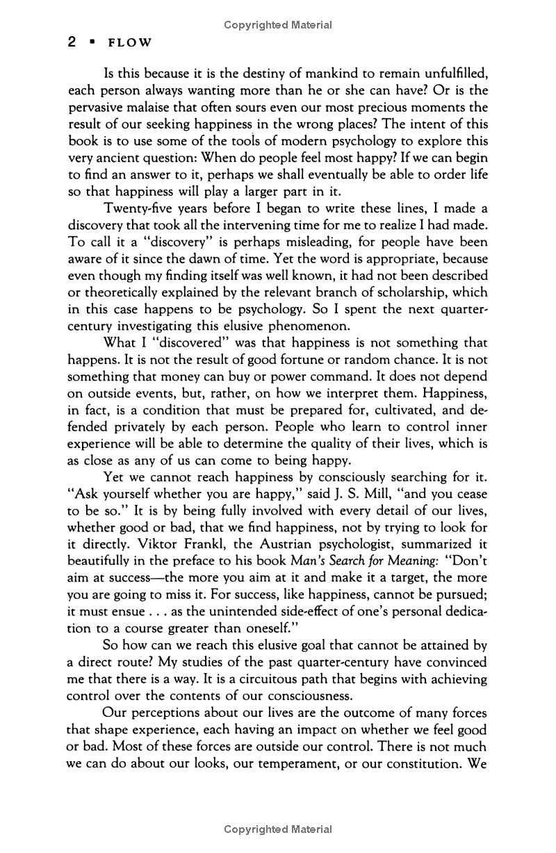 Flow: The Psychology of Optimal Experience Psychologist Mihaly Csikszentmihalyi's famous investigations of "optimal experience" have revealed that what makes an experience genuinely satisfying is a state of consciousness called flow. During flow, people typically experience