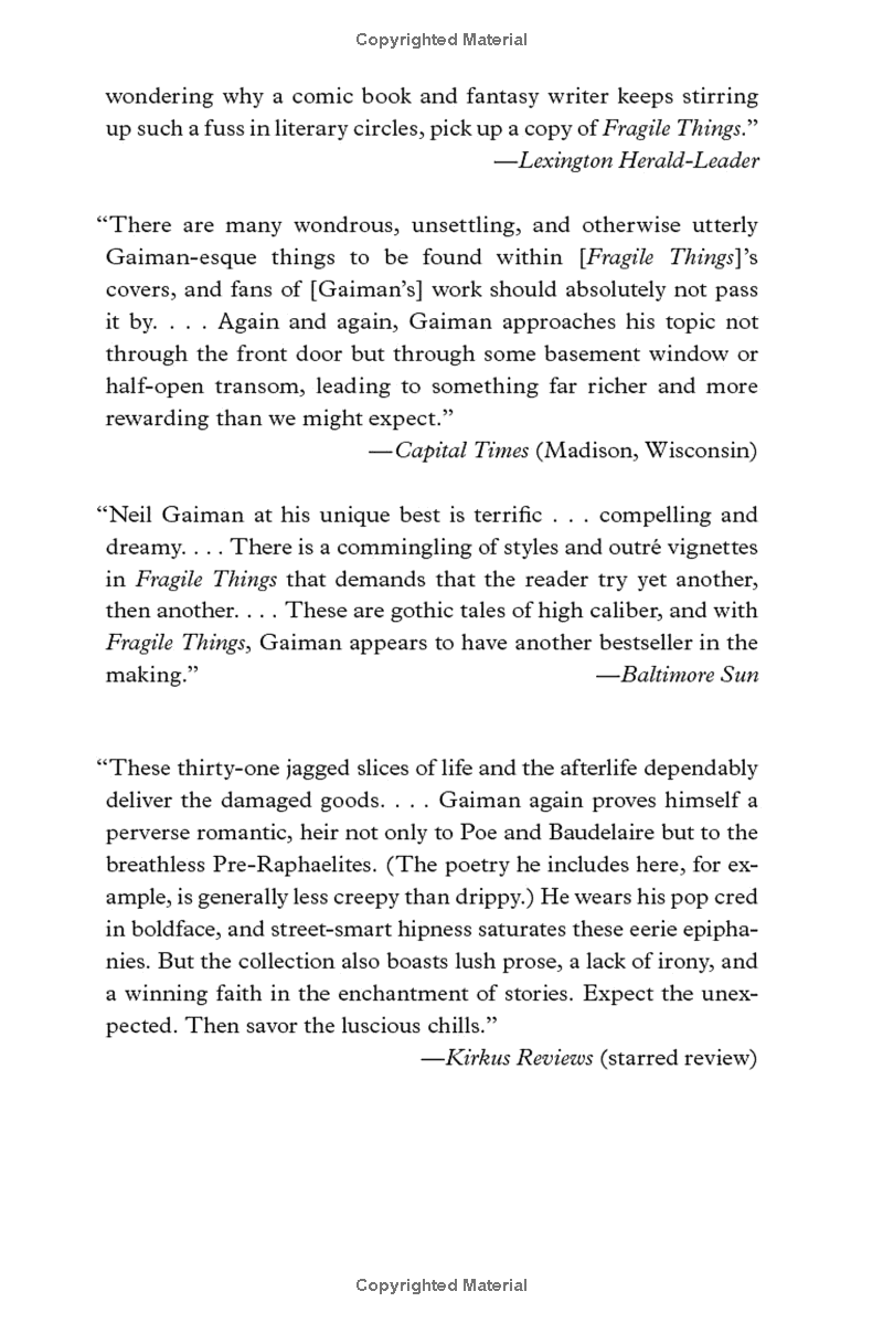 With breathtaking clarity, Fragile Things illumines Gaiman’s brilliance as well as his terrifyingly entertaining dark sense of humor. By turns delightful, disturbing, and diverting, this volume is a gift of enchantments that will startle the senses and stir the soul.