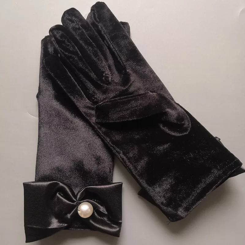Găng tay Cô dâu và Dạ hội, đi tiệc, sự kiện. MS: 45451. Chất liệu: nhung, co giãn. Kiểu dáng: bao kín ngón, ôm tay, đính nơ và ngọc trai. Hoạ tiết: trơn. Độ dài:
