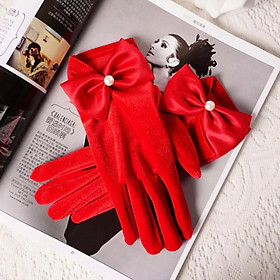✨Găng tay chất liệu nhung đính nơ ngọc trai màu đỏ tươi cho Cô dâu và Dạ hội, đi tiệc, sự kiện, đạo cụ cosplay, chụp ảnh, studio MS: 45451
