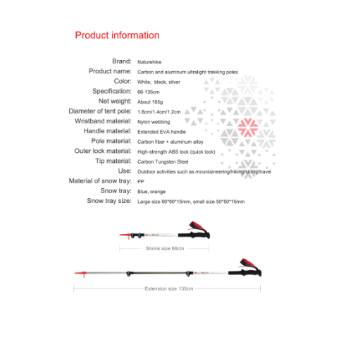 MÔ TẢ SẢN PHẨM * THÔNG TIN SẢN PHẨM - Thương hiệu: NatureHike - Mã sản phẩm: CNK2300DS010 - Chất liệu: Sợi carbon 3k (thân gậy), EVA (tay cầm), nylon (khóa ngoài), thép vonfram (đầu),