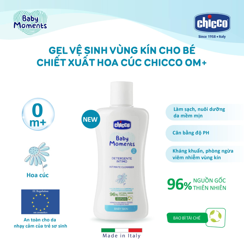 - An toàn cho trẻ sơ sinh: Không chất tạo màu, không Parabens, không Sodium Lauryl Sulfate (SLS) và Sodium Laureth Sulfate (SLES) (SLS và SLES có trong chất tẩy rửa công nghiệp, có thể gây ung thư và ảnh hưởng tới sức khỏe sinh sản). Sản phẩm đã được kiểm nghiệm da liễu. Thành phần đã được Bộ Y tế Ý xác nhận đáp ứng các tiêu chuẩn theo Quy định (EC) Hướng dẫn sử dụng: Làm ướt da bé bằng nước, cho lượng gel vừa đủ dùng ra tay, tạo bọt và massage nhẹ nhàng vùng riêng tư cho bé, sau đó rửa lại bằng nước sạch. Sử dụng sau mỗi lần thay bỉm hoặc vệ sinh cá nhân cho bé.