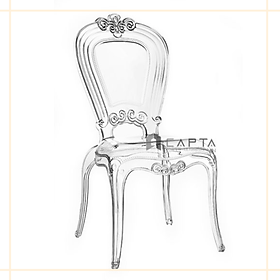 Lưng ghế và phía trước phần mặt ngồi điểm xuyến họa tiết uốn lượn mềm mại. Đường nét tổng thể bo cong gợi lên sự lãng mạn và tinh xảo. Chất liệu nhựa PC cứng chắc, bền bỉ, thoải mái sử dụng ngoài ban công hoặc bố trí khu vực cạnh cửa sổ. Màu trắng trong tạo chiều sâu không gian.