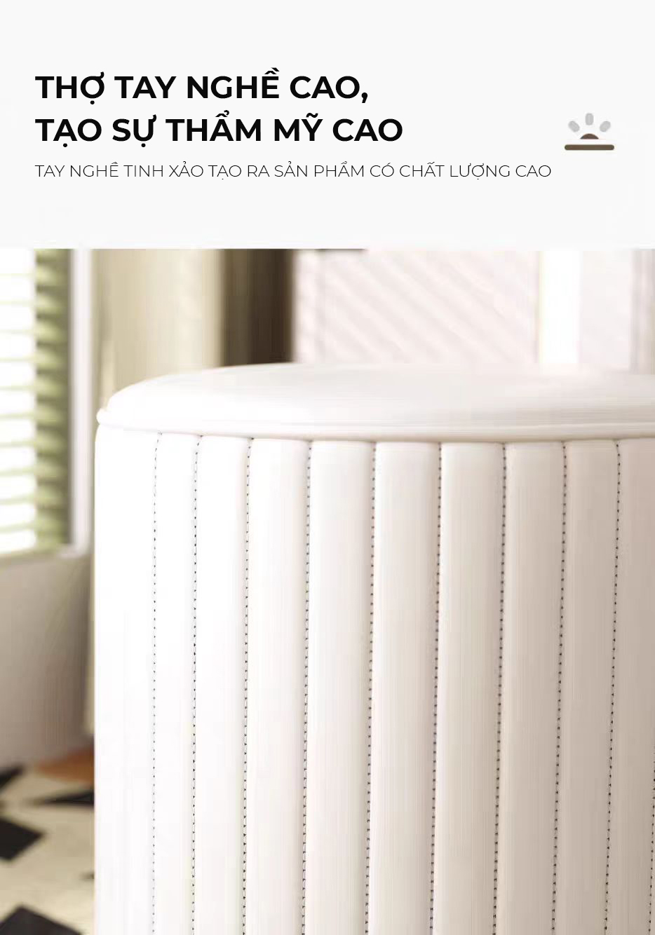 - Kích thước: Cao 37cm đường kính 32cm - Chất liệu: Nỉ nhung - Màu sắc: Trắng kem - Chất liệu: Khung gỗ sồi - Công năng: Ghế đôn sofa, ghế bàn trà, bàn trang điểm, làm việc cực xinh