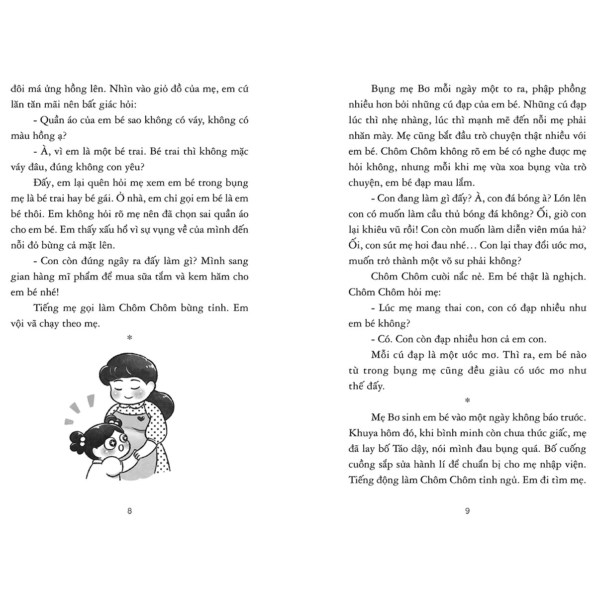 “Chôm Chôm rủ Ổi ra sân vẽ tranh. Sau trận mưa rào, bầu trời xuất hiện cầu vồng. Cầu vồng trong tranh của Chôm Chôm nằm vắt vẻo trên ngọn cây xoài. Còn cầu vồng trong tranh của Ổi như dải lụa bảy màu, nơi lũ chim trời tụ tập chơi trò ú òa mà hồi một tuổi Ổi rất thích.”
