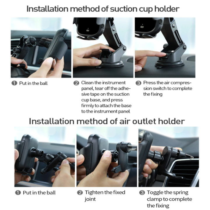 1. Suitable for 4.7-7.2 inches screen phones 2. Rotatable pivot structure allows multi-angle adjustable 3. Auto-Clamp Linkage: lock your phone tightly with five gravity arms 4. Arc-Shaped mounting clip: Firm Grip Onto Air Vent 5.