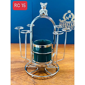 Khay úp cốc 6 chiếc hình gấu mạ vàng, có ống sứ cắm thìa dĩa Giá úp ly, úp cốc mạ vàng kèm ly sứ men xanh đựng dĩa thìa Giá úp có 6 cột