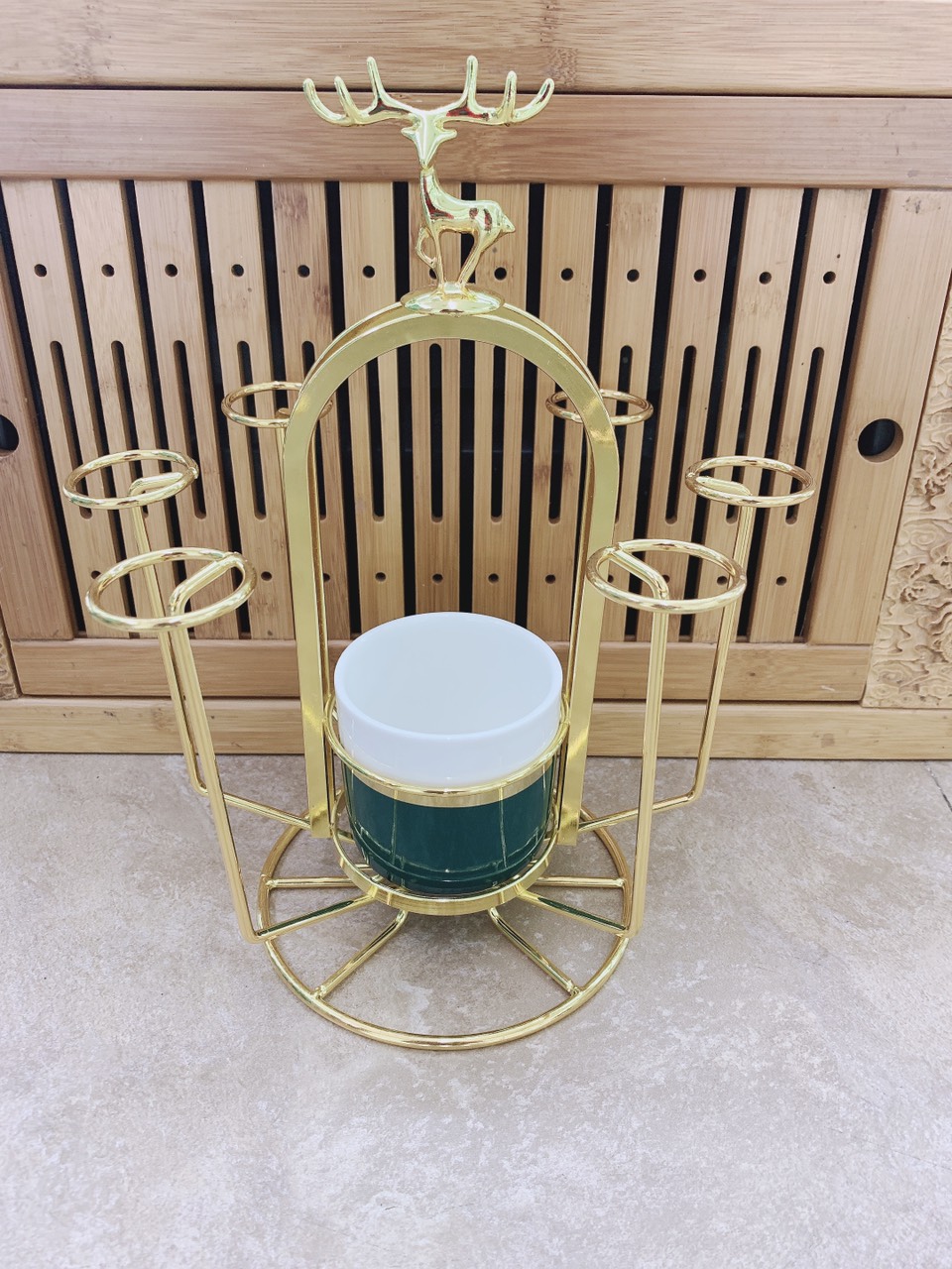 Khay úp cốc 6 chiếc hình gấu mạ vàng, có ống sứ cắm thìa dĩa Giá úp ly, úp cốc mạ vàng kèm ly sứ men xanh đựng dĩa thìa Giá úp có 6 cột