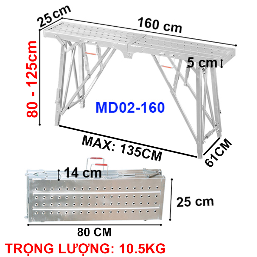 Giàn giáo di động, chắc khỏe, an toàn Có nhiều kích thước để lựa chọn dài: 1m2, 1m4, 1m6, 1m8, 2m Tải trọng: 150kg Chiều cao có thể thay đổi từ 60- 145cm (tùy kích