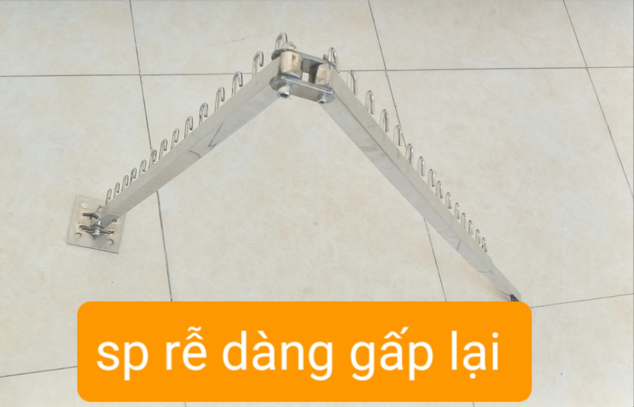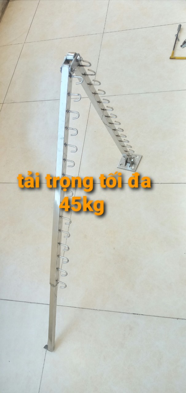 cty inox khởi hòa chúng tôi chuyên sx các sp về inox với dòng sp giá phơi quần áo có kích thước 180 cm tải trọng tối đa cho sp là 45kg ,sp được sx như sau                                                                               1..../ mặt bích inox dày 5mm được đột 4 lỗ bắt vít vào tường (sp kèm theo 4 vít lục giác và nở nhựa)  2.../ thanh mắc áo được làm bằng hộp 2,5x2,5 cm inox dày 1.2mm                                                    3     móc treo quần áo được làm bằng cây inox đặc 5mm                                                                      4     toàn bộ thanh được kết nối bằng ốc lục giác inox 100% ,                                                                5     giàn phơi có thể lắp đặt tại ban công ,sân vườn ,cạnh cửa sổ vvv